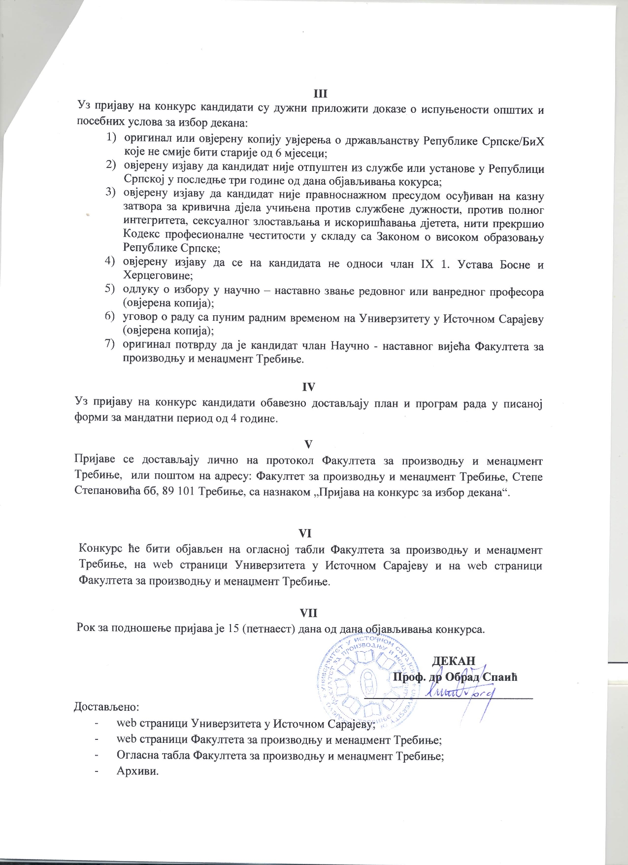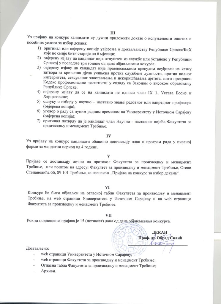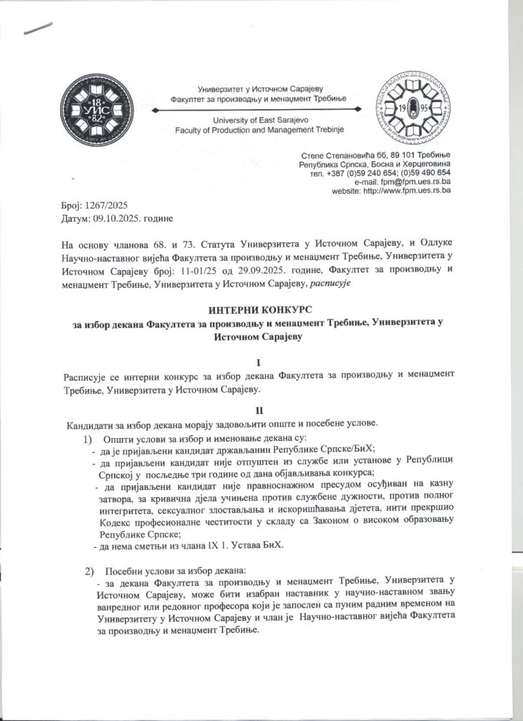 ИНТЕРНИ КОНКУРС за избор декана Факултета за производњу и менаџмент Требиње, Универзитета у Источном сарајеву Постављено 9. октобра 2025. ИНТЕРНИ КОНКУРС за избор декана Факултета за производњу и менаџмент Требиње, Универзитета у Источном сарајеву