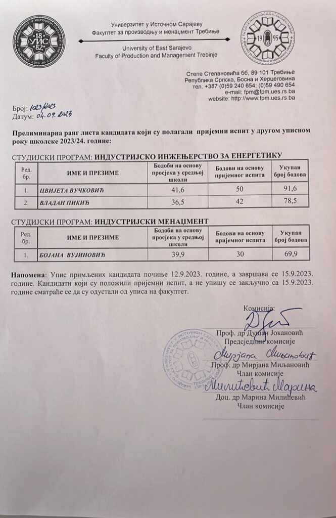 Прелиминарна ранг листа кандидата који су полагали пријемни испит у другом уписном року школске 2023/24. године: